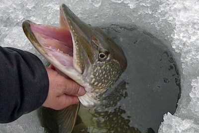 На лед достать щуку проще всего багориком, но это при внушительных размерах добычи, конечно. А для крупного экземпляра нужна лунка побольше!