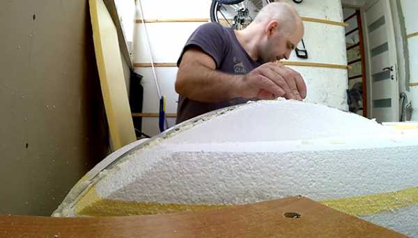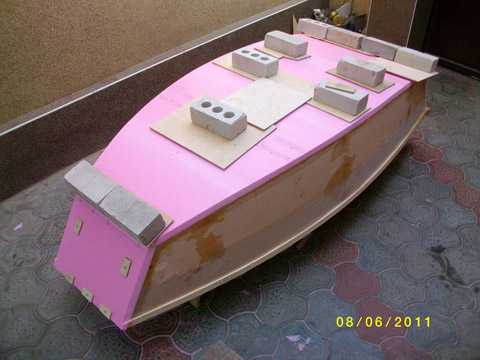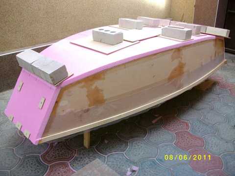Для этого потребуется уделить время тому, чтобы из листов пенопласта вырезать заготовки требуемой формы, которые впоследствии будут склеены между собой. Такой подход улучшит ходовые характеристики, снизив сопротивление воды во время движения.