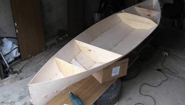 После поклейки всех бортов должна получиться такая конструкция, которая уже напоминает по форме лодку. Можно заметить, что передняя часть находится под наклоном к днищу. Ближе к передней части борта закругляются, чтобы сделать лодку более обтекаемой. Чтобы этого добиться, потребуется немного срезать верхний слой днища. Нижний пока трогать не стоит, т. к. он выступает в роли стабилизатора до полного набора прочности конструкцией.
