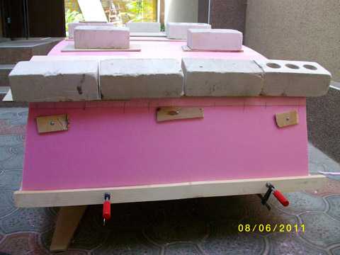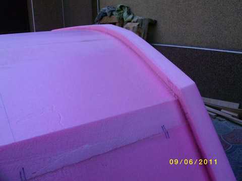 Каждая секция набирается из плит пенопласта, имеющих толщину 80 миллиметров. Их вырезают по шпангоутам, обладающим формой поперечных сечений отсеков. На байдарку длиной 6 метров понадобится примерно 75 таких плит. Они вырезаются по чертежам сильно нагретой нихромовой проволокой. Важно делать это осторожно, так как при горячей резке пенопласта выделяются токсичные газы.