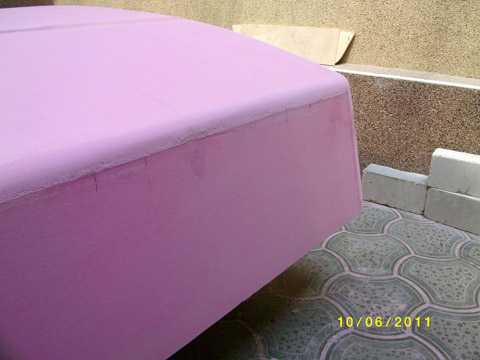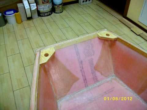 Основным завершающим этапом сборки лодки из пенопласта является ее оклейка стеклотканью. Для работы потребуется стеклоткань 300. Ее количества должно хватить на то, чтобы оклеить лодку в два слоя. Перед поклейкой производится дополнительная подготовка основания лодки. Для этого по всем углам лодки закрепляется металлический уголок, который применяется при шпаклевке. Целью такого мероприятия является укрепление углов и сохранение их формы. Уголки могут быть временно зафиксированы небольшими саморезами.