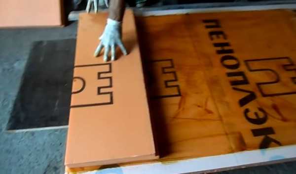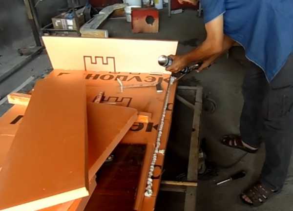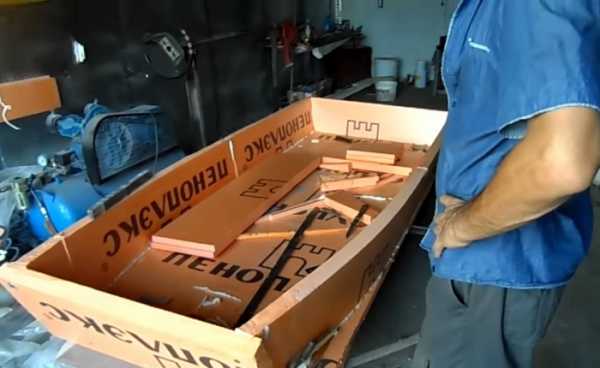 Первым делом необходимо подготовить площадку, подходящую по размерам для сборки конструкции лодки. Можно использовать передвижной постамент, который при необходимости можно будет транспортировать, не повреждая частично готовую конструкцию. Площадка должна быть чистой и ровной, чтобы утеплитель не продавливался различными твердыми элементами. Днище формируется четырьмя листами, которые имеют размер 120 на 60 см. Приобретать лучше тот материал, что имеет выбранную четверть по торцу. В этом случае стыковать элементы будет проще. На торец наносится небольшое количество клея и утеплитель стыкуется между собой. Чтобы в процессе полимеризации не произошло смещения, швы дополнительно проклеиваются малярным скотчем, а сверху укладывается подходящий груз, как показано на фото выше.