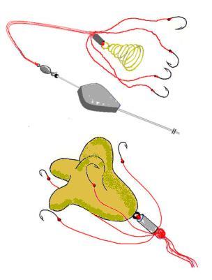 После использования снасти, с уловом иди без, плетёнка поводков с крючками ослабляется и выводится из петли, и вновь «заряжается» новым кубиком макухи и поводком с крючками.