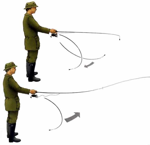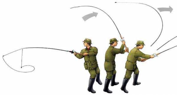 Самое главное – это исполнение, от чего и будет зависеть дальность полета приманки. Чтобы это осуществилось, нужен мощный, резкий бросок, без остановки в задней точке. Удилище отводится за спину и в тот же момент, как только оно займет стартовую позицию, резким движением вперед приманка отправляется в заданную точку. В этом случае используется энергия изогнутого удилища: чем резче окажется бросок, тем больше энергии сможет запасти удилище и тем дальше полетит приманка.