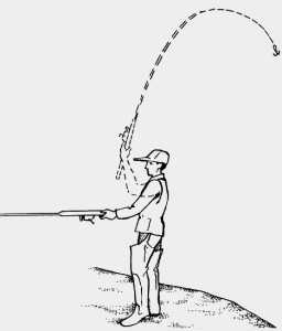 В боковом виде, приманка сантиметров на 20-30 должна свисать с конца спиннинга. Отводим удилище назад в сторону, противоположную от той, в которой держите его. Забросив, наблюдаем, чтобы удилище двигалось вперед и немного вверх, в этот промежуток времени опускается леска.