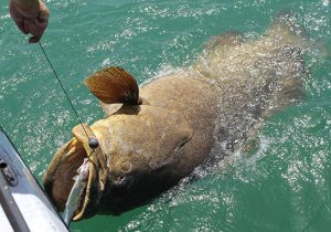 Если вы собираетесь ловить с лодки более крупные виды, такие как морской окунь, то вам понадобится более короткое и более прочное удилище, способное выдержать несколько сотен фунтов, как этот крупный товарищ.