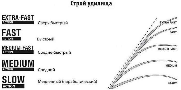 Очень важная характеристика. От нее зависит заброс приманки и успешность вываживания улова. Чаще удилища подразделяются на быстрые, средние и медленные.