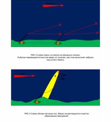 - «На снос». Выполнять забрасывание приманки следует поперёк течения. Игра выполняется в монотонном ритме довольно медленно осуществляя подмотку.