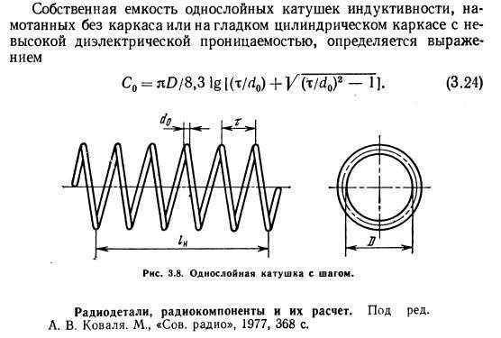 Это то, что касается бескаркасных катушек. При наличии гладкого каркаса расчётная ёмкость изделия увеличится на величину ≈10×ε (%), где ε — относительная диэлектрическая проницаемость материала каркаса. Для катушек, намотанных на каркасах с нарезкой для фиксации витков, коэффициент увеличения ёмкости уже может составлять величину ≈20×ε (%).