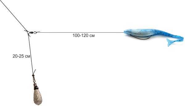 В оснастке может быть использован двойной или тройной вертлюг, а может его вообще не быть. Длина поводка к грузилу и приманке – разная. Опять же, все зависит от условий ловли. Где-то приманка крепится к метровому поводку, где-то его делают короче или длиннее. Длина поводка с грузом как правило не превышает 30 см.