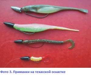В техасской оснастке могут использоваться большинство современных силиконовых приманок. Исторически основной приманкой для техасской оснастки являются различные «черви» (worms). В ловле басса силиконовые черви одна из основных приманок. В наших же условиях с успехом могут использоваться различные слаги, силиконовые раки, креатуры, и подобные приманки.