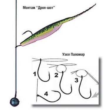 Способы монтажа и применяемые приманки достаточно детально описаны в соответствующей статье. Если вкратце, то к концу отводной лески крепится груз каплевидной формы или, что лучше – дропшотовая палочка. Выше него вяжется вертлюг с длинным поводком из монолески (например, флюрокарбона), к которому в свою очередь крепится приманка. Приманки применяются любые: от твистеров и виброхвостов, до креатур, раков и даже небольших плавающих воблеров с малым заглублением.