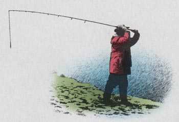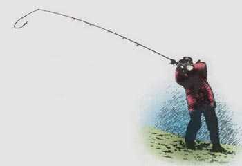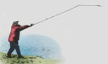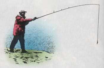 - После этого поставьте спиннинг под углом в 90 градусов к берегу.