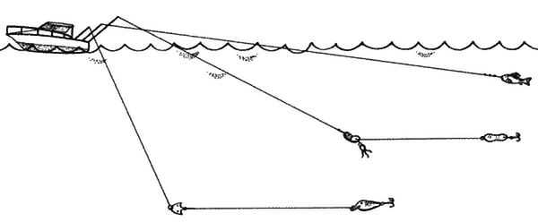 Для организации этого вида рыбной ловли, наличие катера или лодки с подвесным мотором является обязательным. Суть метода заключается в том, что на корме плавсредства на специальном креплении устанавливается спиннинг, оснащённый искусственной приманкой или живой рыбкой. При движении лодки приманка проводится в толще воды и привлекает голодного хищника своими движениями.